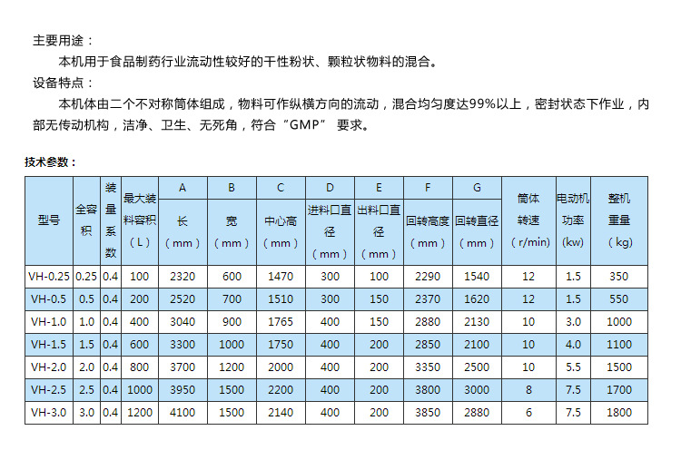 產(chǎn)品概述: 本機(jī)適用于制藥、化工、食品的干粉狀、顆粒裝物料的混合。該機(jī)混料筒結(jié)構(gòu)獨(dú)特,混合均勻,效率高,不積料。整機(jī)結(jié)構(gòu)簡(jiǎn)單,操作容易。外表面和物料接觸部分均采用優(yōu)質(zhì)不銹鋼制造,造型美觀,維護(hù)、清洗方便。 應(yīng)用場(chǎng)景: 本機(jī)用于制藥及其它行業(yè)的粉狀或粒狀物料混合之用。本系列混合機(jī)有高效混合型和普通混合型兩種,高效型混合機(jī)主要對(duì)較細(xì)的粉;?qū)δ骋恢髁虾枯^少的物料均能混合均勻;普通型混合機(jī)主要適用于一般物料或產(chǎn)量較大的企業(yè)使用。筒體光滑無(wú)死角、整機(jī)采用不銹鋼材料制作、且外型美觀等特點(diǎn)。 工作原理: 本機(jī)一端裝有電機(jī)與減速機(jī),電機(jī)功率通過(guò)皮帶傳給減速機(jī),減速機(jī)再通過(guò)聯(lián)國(guó)器傳給V型桶。使V型桶連續(xù)運(yùn)轉(zhuǎn),帶動(dòng)桶內(nèi)物料在桶內(nèi)上、下、左、右進(jìn)行混合。 材質(zhì)及結(jié)構(gòu): 1、 混合機(jī)的筒體采用2.5mm304-2B不銹鋼材料制作,外包采用1.2mm304-2B的不銹鋼材料制作,支架采用5#槽鋼。 2、混合的出料閥選用全不銹鋼精加工而成,并在連接處采用定型硅橡膠材料密封,確保機(jī)器在工作時(shí)的密封效果。 3、混合機(jī)的進(jìn)料口采用選進(jìn)的快開結(jié)構(gòu),使用戶在進(jìn)料和清洗時(shí)操作簡(jiǎn)便。 4、混合機(jī)筒體兩側(cè)拼縫處加焊兩塊不銹鋼引板并采用拋光處理,使筒體內(nèi)無(wú)一處死角,確;旌蠙C(jī)在混合、清洗時(shí)能夠達(dá)到理想的效果。 5、混合機(jī)內(nèi)設(shè)有強(qiáng)制攪拌裝置。